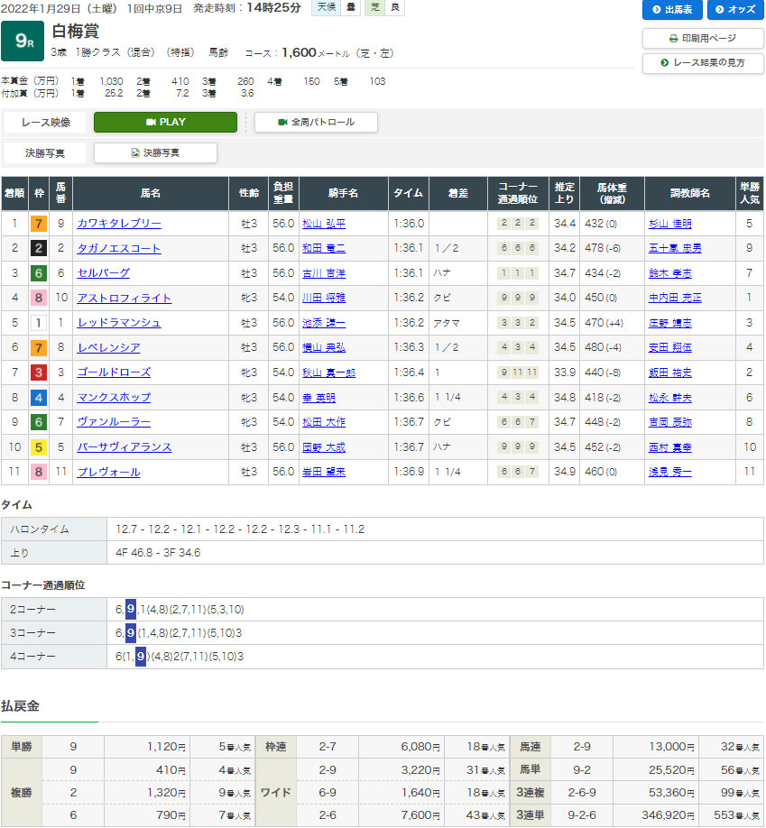 中京の馬場状態はタフな割にこの上がり時計では、外を回った馬達は厳しい展開に逃げた⑥セルバーグが3着に残る展開で、2番手追走の⑨カワキタレブリーが勝った!