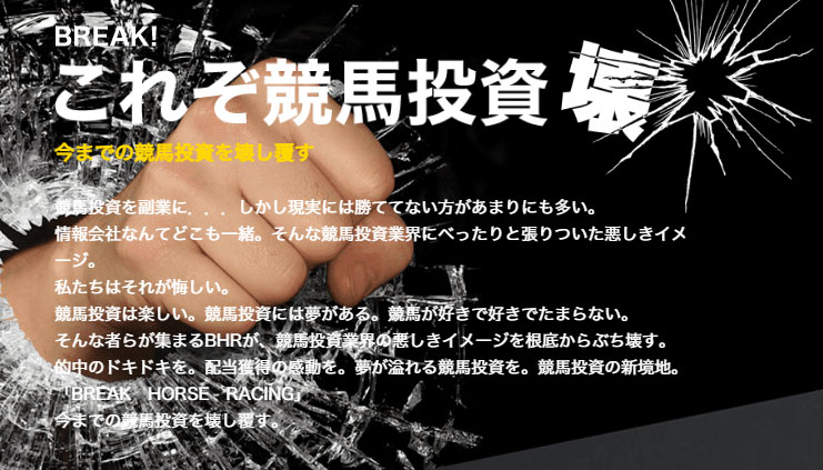 【ブレイクホースレーシング】ですが、「今までの競馬投資を覆す」そうで情報会社はどこも一緒で競馬投資業界に貼りついた悪いイメージをぶち壊すそうです。