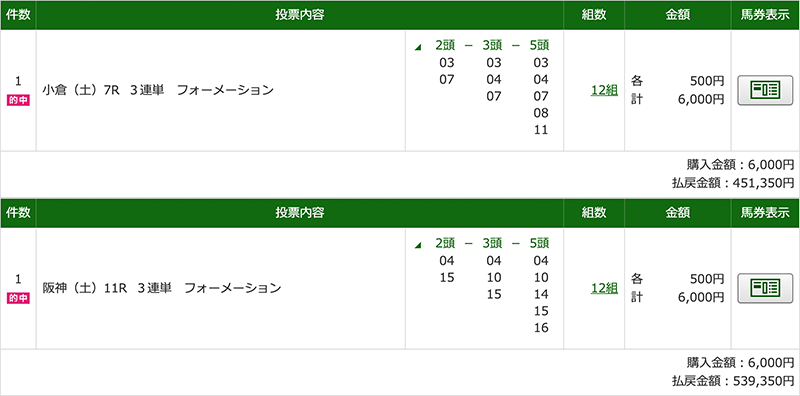 難しい予想は競馬のプロに全任せで、全乗っかりするだけで毎週これくらいの的中がもらえます。