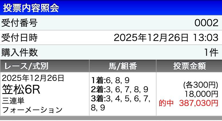 今日の無料情報12/31(水) ⑨が除外になったので3頭で買いましたが、ズバリでした💦脱帽です