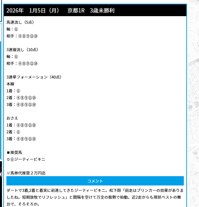 配当狙って3連単1点狙いで無料予想使って正解でしたわ! 馬券代2万円推奨だったので1点500円点数40点で2万円に合わせて利用しました。結果は馬連も3連複も3連単も当たり、唯一馬券買っていた3連単のオッズは317.4倍も付いてくれたおかげで馬券代2万がかすみますね!!! 推奨通りの購入で15万8700円払い戻しでした、朝一発目のレースからこんな的中もらえると痺れますね!